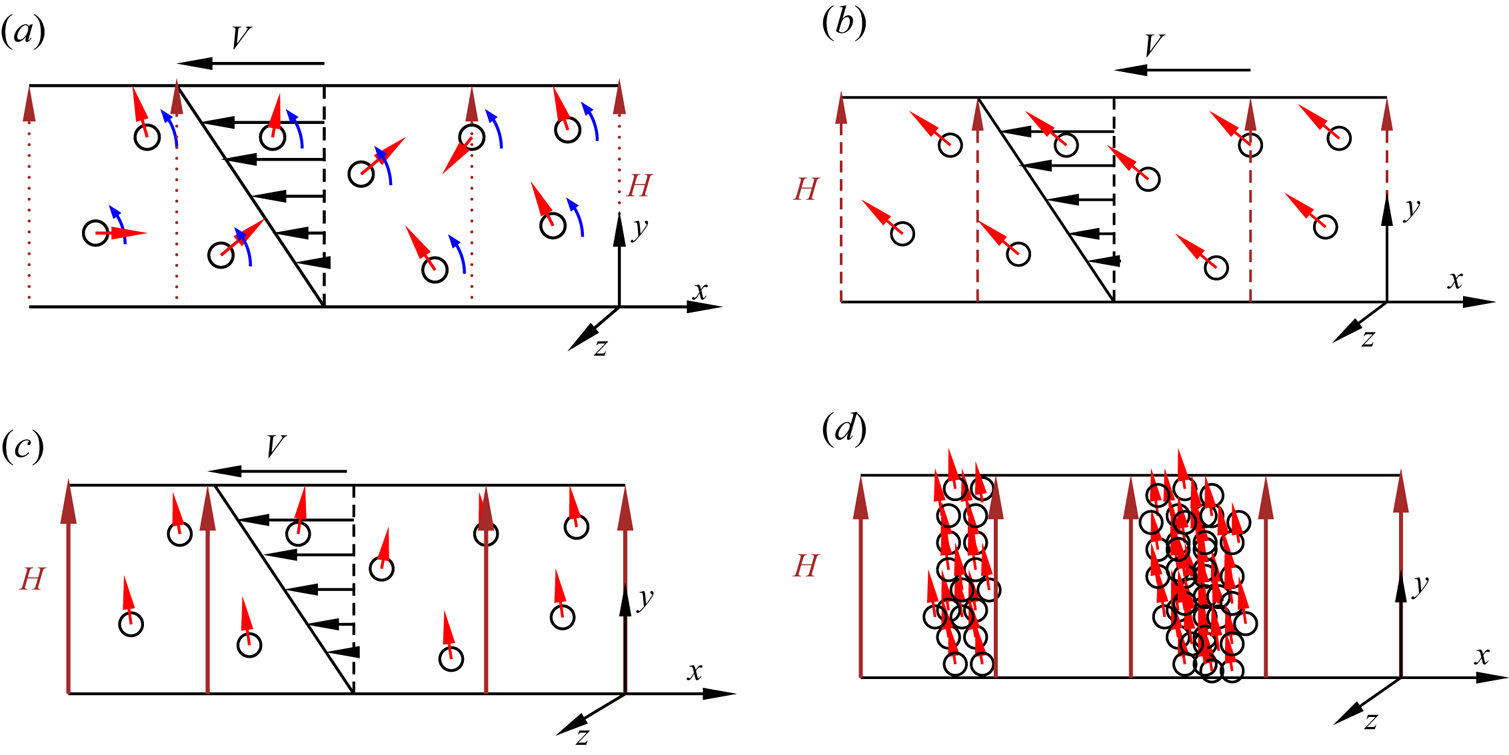 Consider a suspension of spherical magnetic particles sheared between two plates, as shown in figure 1. The effect of any demagnetising field at the boundaries is neglected in the analysis, since we are considering concentration fluctuations in the bulk. The red arrows show the magnetic moment of the particles, and the blue arrows indicate the direction of rotation of the particles due to the fluid shear. When there is no magnetic field, there is no magnetic torque, and the hydrodynamic torque is zero in the viscous limit. The particles rotate with angular velocity equal to the local fluid rotation rate, which is one-half of the vorticity. When a small magnetic field is applied, there is a torque on the particle that depends on the particle orientation. The particles do rotate, but with average angular velocity smaller than the fluid rotation rate, as shown in figure 1(a). When the magnetic field is increased beyond a threshold, the particles do not rotate; the static orientation is determined by a balance between the magnetic and hydrodynamic torques, as shown in figure 1(b). There is a transition between rotating and steady states when the dimensionless parameter