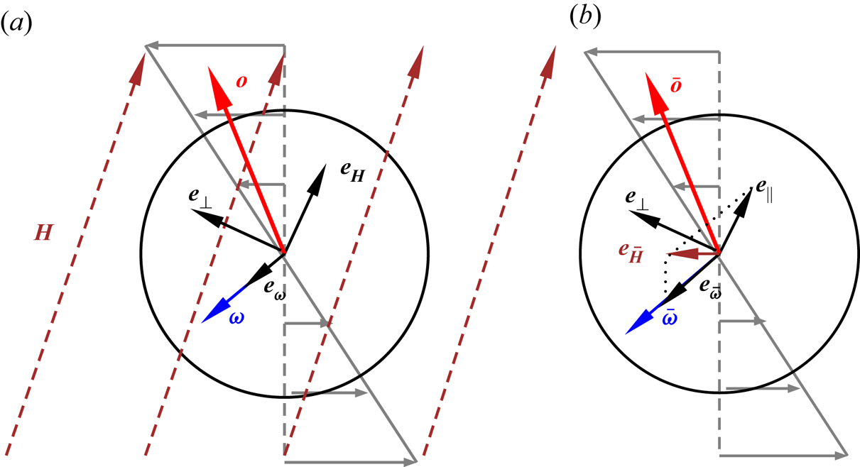 Rather than fitting the measured or simulated rheology to a specific constitutive relation, the approach here is to examine the effect of particle interactions in a suspension with well-dispersed particles. This is similar to the effect of particle interactions on the viscosity of a non-Brownian particle suspension (Batchelor Reference Batchelor1970; Hinch Reference Hinch1977). The dynamics of a spheroidal particle subjected to a shear flow and a magnetic field has been studied (Almog & Frankel Reference Almog and Frankel1995; Sobecki et al. Reference Sobecki, Zhang, Zhang and Wang2018; Kumaran Reference Kumaran2020a, Reference Kumaran2021a,Reference Kumaranb). In the absence of a magnetic field, the particle axis rotates in closed ‘Jeffery orbits’ (Hinch & Leal Reference Hinch and Leal1979; Jeffery Reference Jeffery1923) on a unit sphere. When a magnetic field is applied, the magnetic torque tends to align the particle along the field direction. When the magnetic field is below a threshold, the particle rotates with frequency lower than the Jeffery frequency. When the magnetic field exceeds the threshold, the particle has a steady orientation that inclines progressively towards the field direction as the field strength is increased. The transition between steady and rotating states depends on the particle shape factor and the magnetisation model, and there could also be multiple steady states. Here, the effect of interactions is studied for a suspension of spherical particles. Though this configuration is sufficiently simple that the particle orientation can be determined analytically, it does provide physical insight into the mechanisms that drive the collective behaviour of the particles.