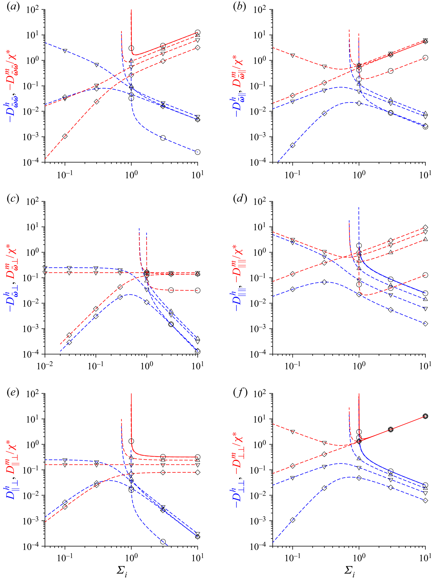 $\varSigma, \varSigma _i \gg 1$, two principal directions of the diffusion tensor are along the magnetic field and along the vorticity direction (perpendicular to the flow plane), while the third component is orthogonal to the first two. For particles with permanent and induced dipoles, the eigenvalues of the diffusion tensor in the two directions perpendicular to the magnetic field are negative and diverge proportional to