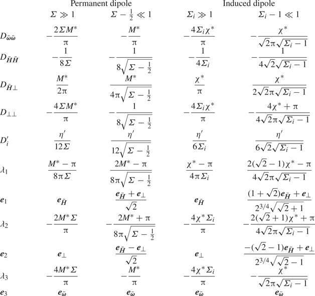 $(\varSigma _i - 1)^{-1/2}$ for permanent and induced dipoles. The eigenvalue of the diffusion matrix in one of the principal directions in the flow plane is negative, indicating strong clustering, while that in the other principal direction is positive when