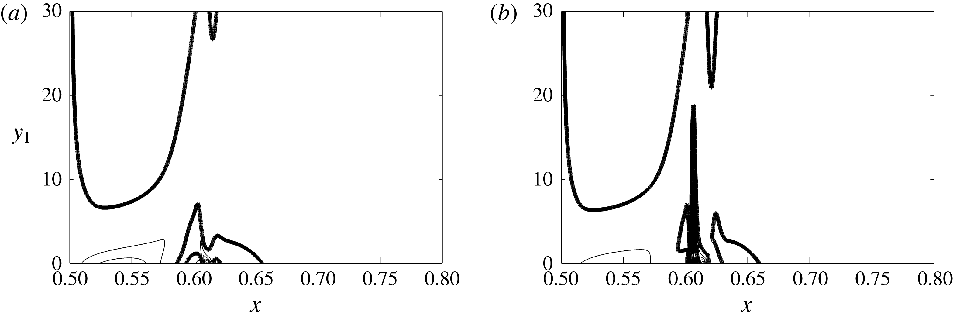 (figure 17, bottom), parallel vorticity gradients increase rapidly, and soon the cut-off parallel wavenumber of the numerical scheme becomes insufficient to resolve it. The convergence of the Navier–Stokes boundary vorticity is lost over a wide interval in