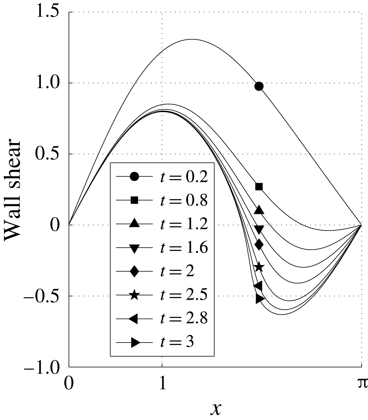 The results are then compared with figure 10 and table II of VDS. Figure 15 shows the wall shear stress for different time instants. It is in very good qualitative agreement with figure 10 of VDS, except maybe at very short times, which is to be expected given the singular initial condition. Additionally, our estimate for the quantity