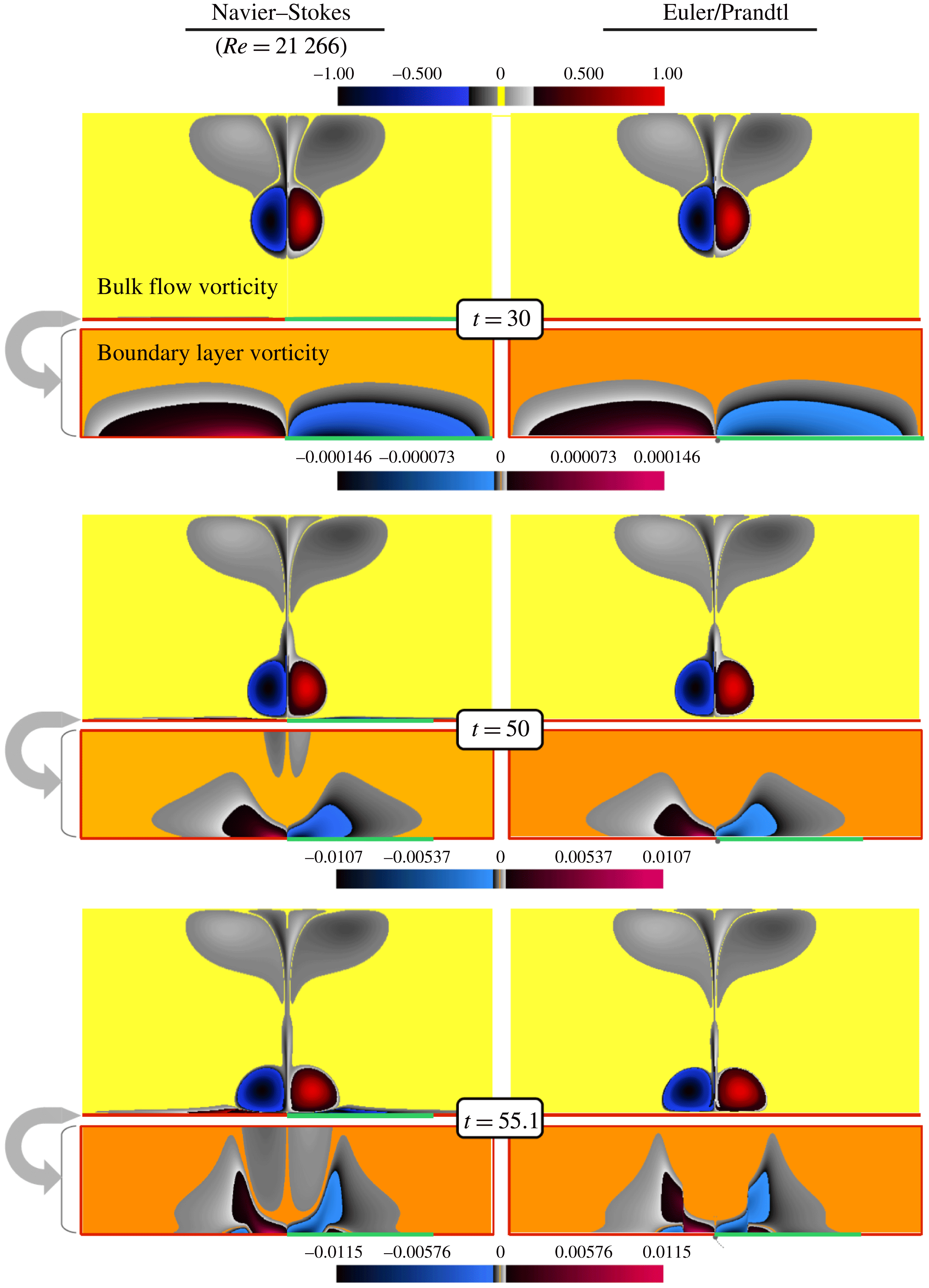 The dipole first shoots towards the lower channel wall. The Navier–Stokes vorticity field in the bulk (figure 17 top, left) remains very close to the Euler vorticity field (figure 17 top, right). Plotting the Navier–Stokes flow in the Prandtl boundary layer units (figure 17 top, left) reveals that it is smooth, and very well approximated by the solution of the Prandtl equations (figure 17 top, right). The vorticity along the boundary (figure 19 a) converges to the Prandtl values as the Reynolds number increases.