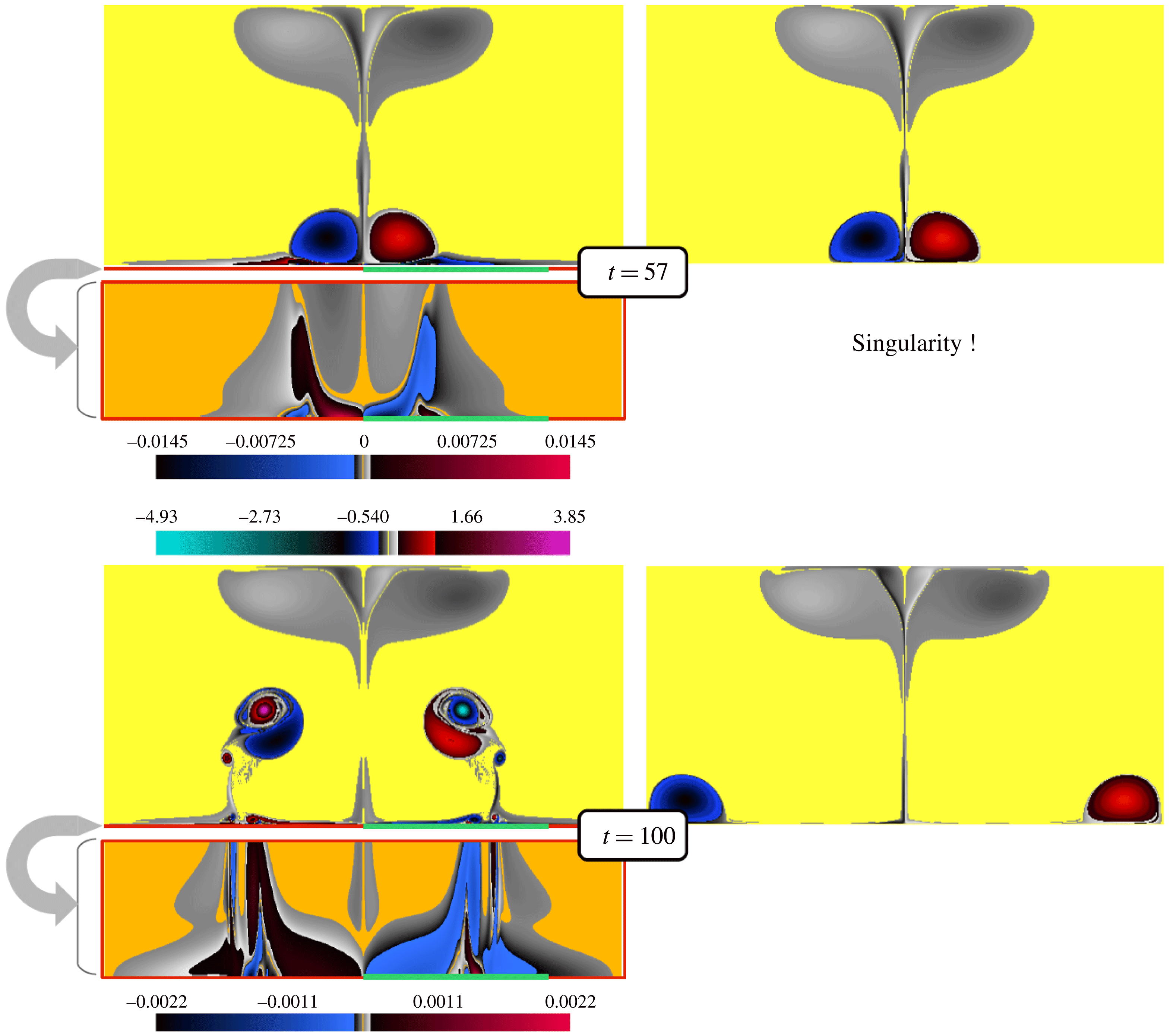 (figure 18, bottom), the Euler and Navier–Stokes solutions have become completely different. In the Euler case, the vortices glide along the wall, having paired with their mirror image, no new vorticity has been generated and the energy is conserved. In the Navier–Stokes case, the detachment process has led to the formation of two new vortices (shown in cyan and magenta in figure 18, bottom, left) of much larger amplitude than those of the incoming dipole. The activity in the boundary layer remains intense, leading to the ejection of smaller structures.