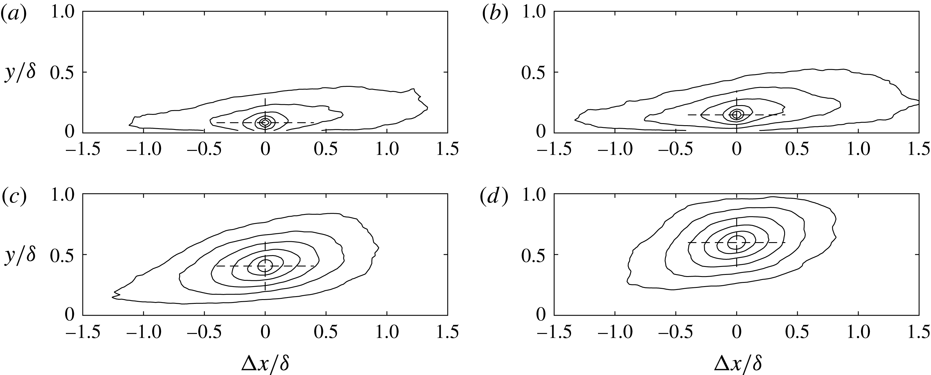 contour, using estimates of the gradient in the correlation with streamwise separation at this contour. The Reynolds numbers for the cases shown vary between