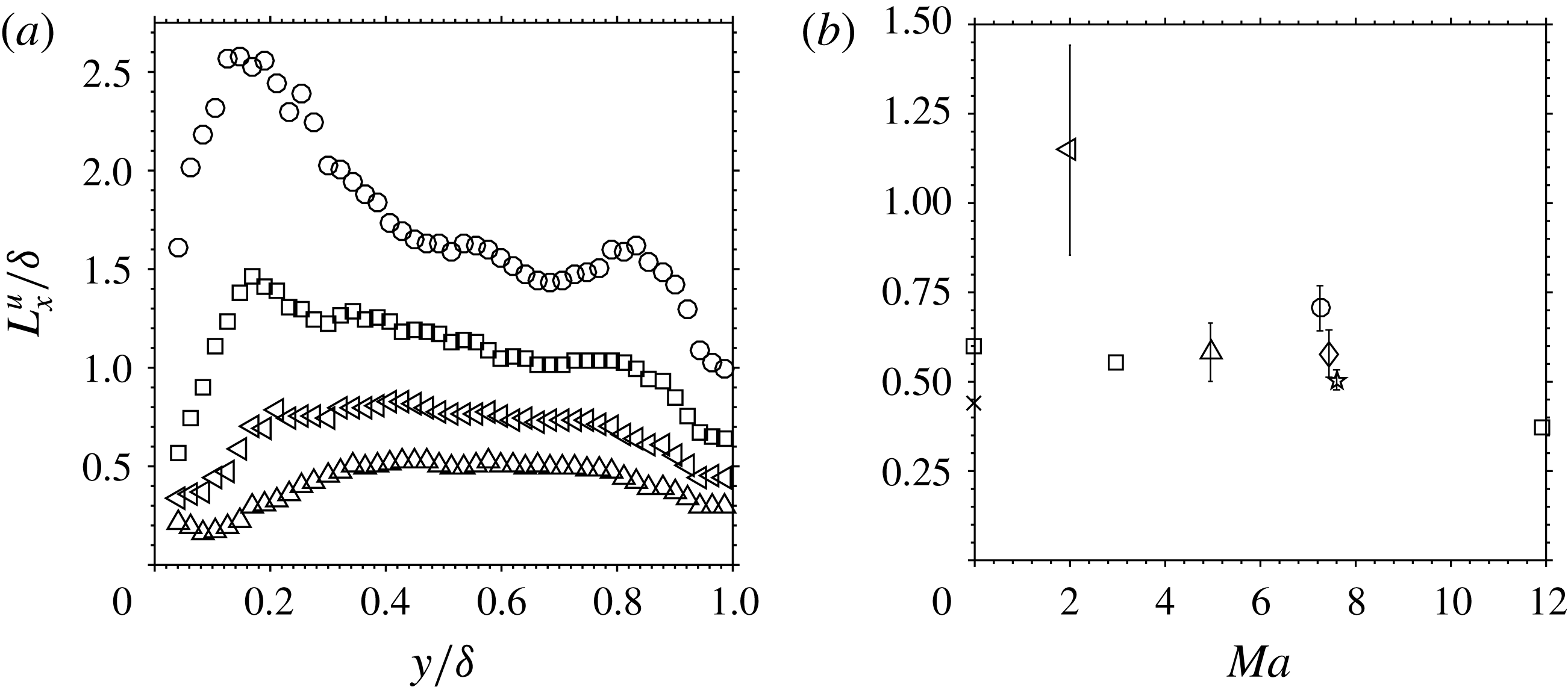 Smits & Dussauge (Reference Smits and Dussauge2005) concluded on the basis of previous work that, within the scatter of available data, the integral length scale tends to increase with Reynolds number and decrease with Mach number. The integral length scales were always determined from hot-wire data and often involved the extrapolation of either
