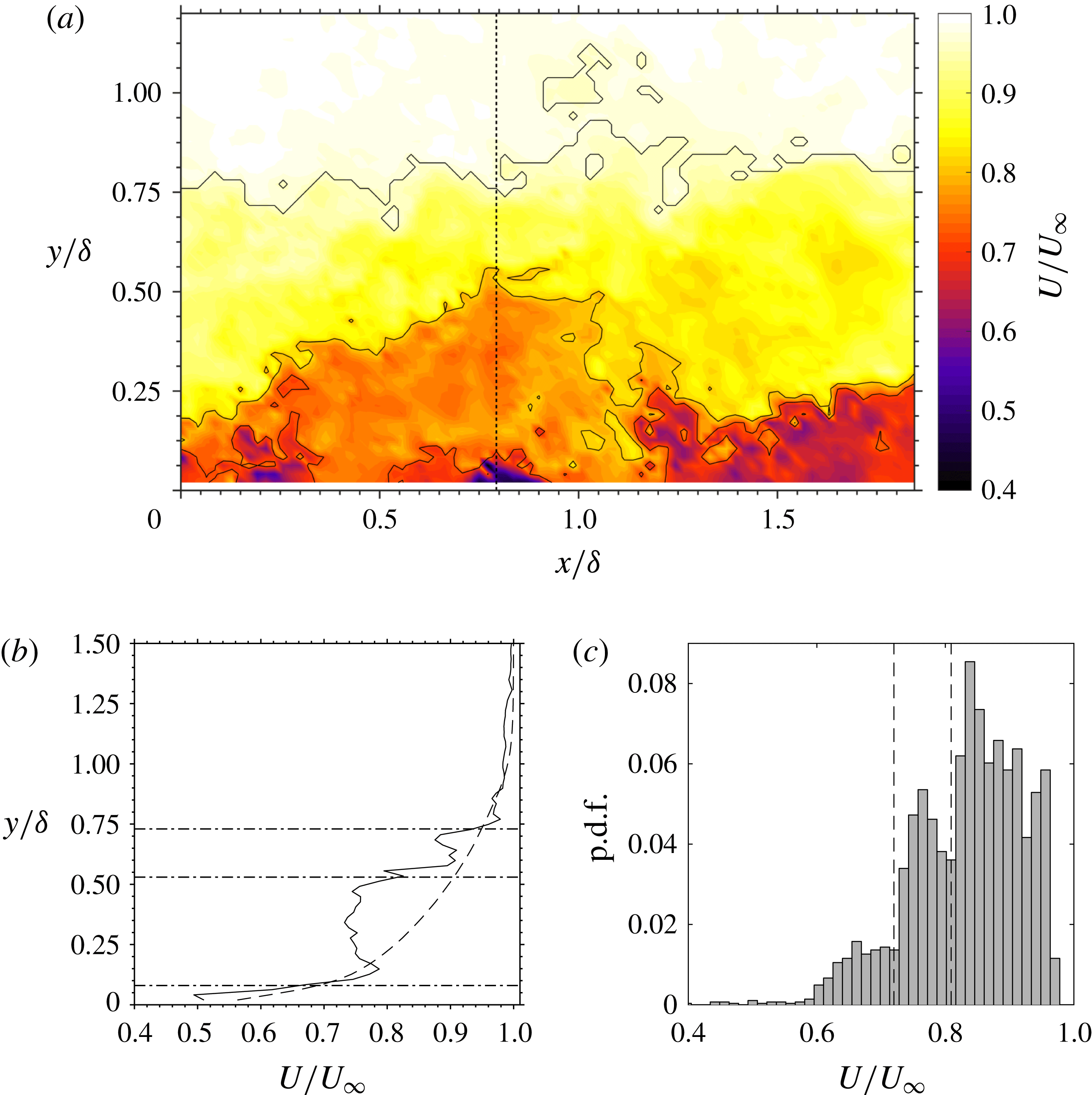 Figure 15. (a) Example of instantaneous streamwise velocity field from Case 4. Dark contours indicate the edge of each UMZ as found using the p.d.f. shown in part (c) and the TNTI as determined using the method of de Silva et al. (Reference de Silva, Philip, Chauhan, Meneveau and Marusic2013). (b) Comparison of instantaneous (——) and mean (- - - -) velocity profiles at the location indicated in part (a) (dotted line). Dot-dash lines delineate three different uniform momentum zones. (c) The p.d.f. of streamwise velocities in this instantaneous velocity field. Dashed lines indicate the edges of each UMZ. The non-turbulent free stream has been omitted when constructing this p.d.f.