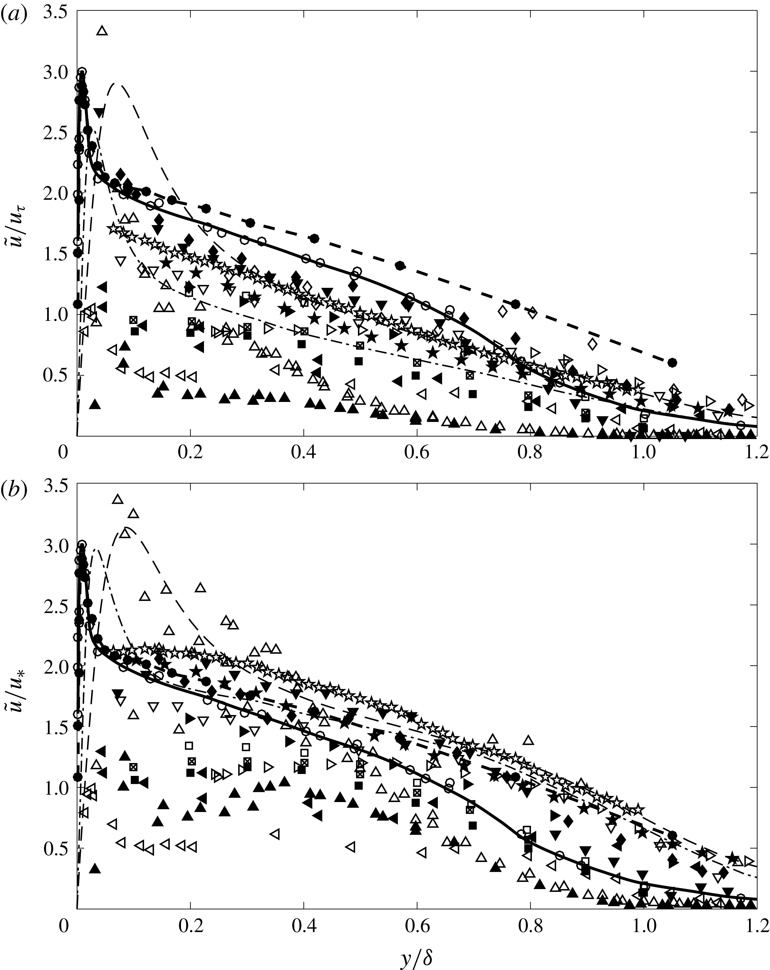 ]. Other symbols for current dataset, as in table 6. Error bars indicate variability for indicated range of wall-normal locations.
