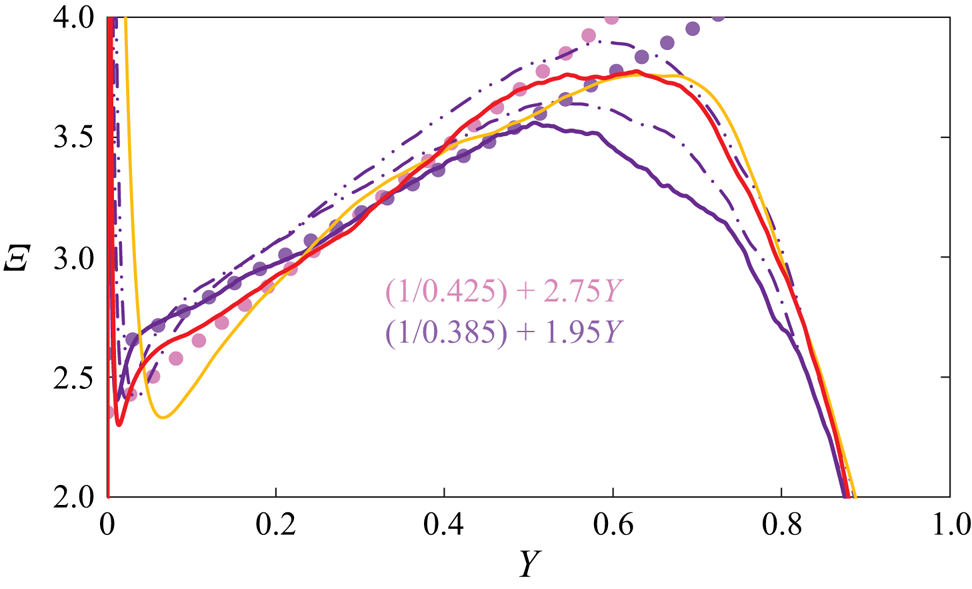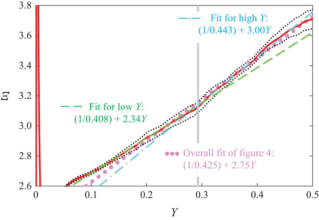 Figure 12. Detail of $\varXi (Y)$ [(red) —] for the pipe DNS of Yao et al. (Reference Yao, Rezaeiravesh, Schlatter and Hussain2023, figure 5) at