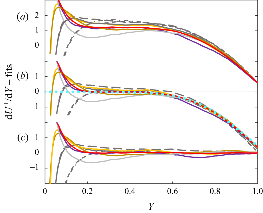 $\mathrm {d} U^+/\mathrm {d} Y$, taken from figure 4(b) of Monkewitz (Reference Monkewitz2021):