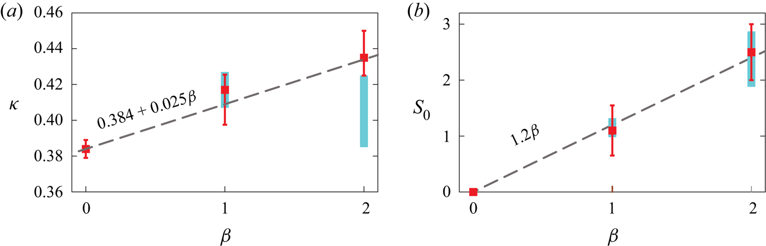 $\beta \equiv -(\hat {\mathcal {L}}/\widehat {\tau _w}) (\mathrm {d} \hat {p}/\mathrm {d} \hat {x})$, equal to 1 and 2 for channel and pipe. Blue vertical bars, range of values deduced from the DNS of figures 3 and 5; red