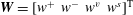 $\boldsymbol{W}=[w^{+}~w^{-}~w^{v}~w^{s}]^{\text{T}}$