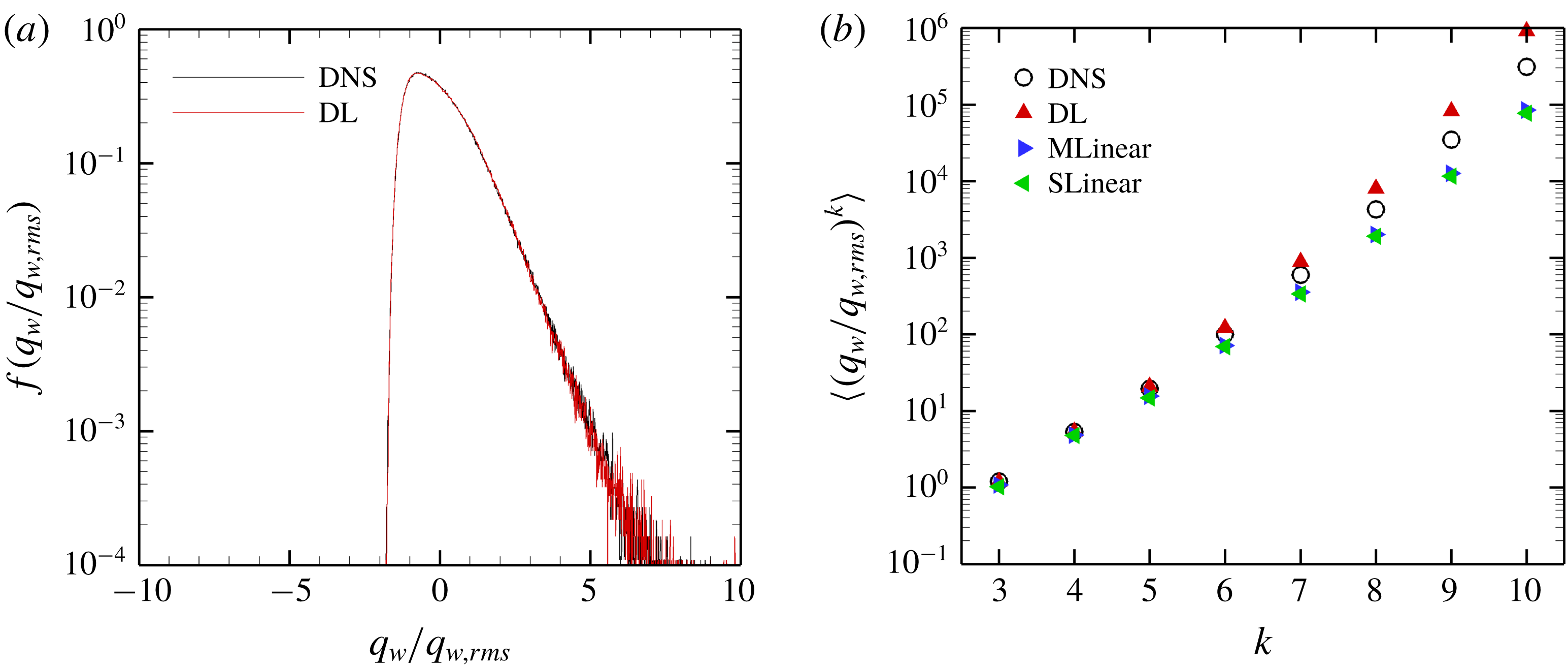 of the multiple linear regression. The p.d.f. and high-order moments of the optimal model also agree well with the DNS, confirming that deep learning can predict turbulent heat transfer considerably well. For the tests at