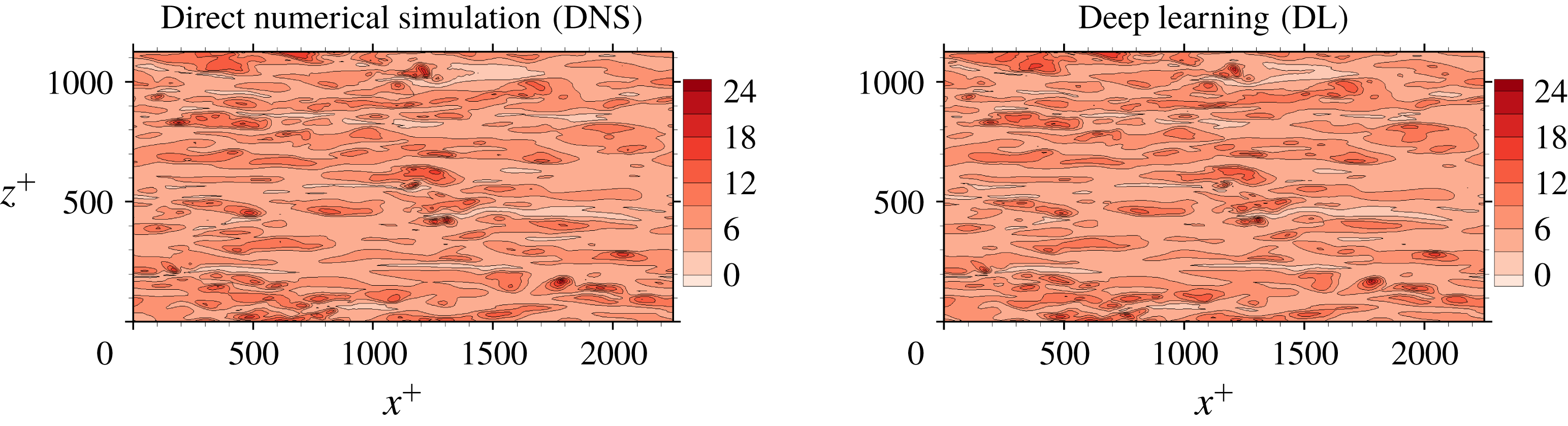 are illustrated in figure 25. Although the locally high heat flux is not completely represented as compared to the DNS data, the overall trend is well captured by DL-RV, while in the prediction by MLinear-RV, the small-scale behaviours are hardly found. These results clearly indicate that our DL model has the potential to be applied to low-resolution simulations such as RANS or LES.