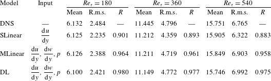 In addition, the results of deep learning procedures that were carried out for quantification of the relationship between one field and other fields for various combinations of input and output are given in table 6. Here, for the test at a higher Reynolds number than the trained number, a similar scaling process as that applied to (3.2) and (3.3) was applied. As the preprocess of the input, the shear stresses and the heat flux except the pressure are scaled by the ratio of the frictional Reynolds numbers and the ratio of the Nusselt numbers, respectively. As the postprocess of the output, the predicted shear stresses except the pressure are scaled by the inverse ratio of the frictional Reynolds numbers.