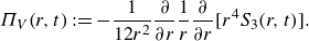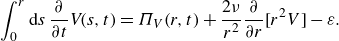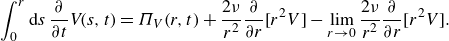 \begin{align} \frac {\partial }{\partial t}\int _{r}^{\infty }{\textrm d}s\, V\!(s,t)&=\int _{r}^{\infty }{\textrm d}s\frac {\partial }{\partial s}\Pi _{V}(s,t)+2\nu \int _{r}^{\infty }{\textrm d}s\frac {\partial }{\partial s}\frac {1}{s^{2}}\frac {\partial }{\partial s}{[ s^{2}V\!(s,t) ]}\nonumber \\ &=-\int _{0}^{r}{\textrm d}s\frac {\partial }{\partial s}\Pi _{V}(s,t)- \int _{r}^{\infty }{\textrm d}s\, D(s,t), \end{align}
