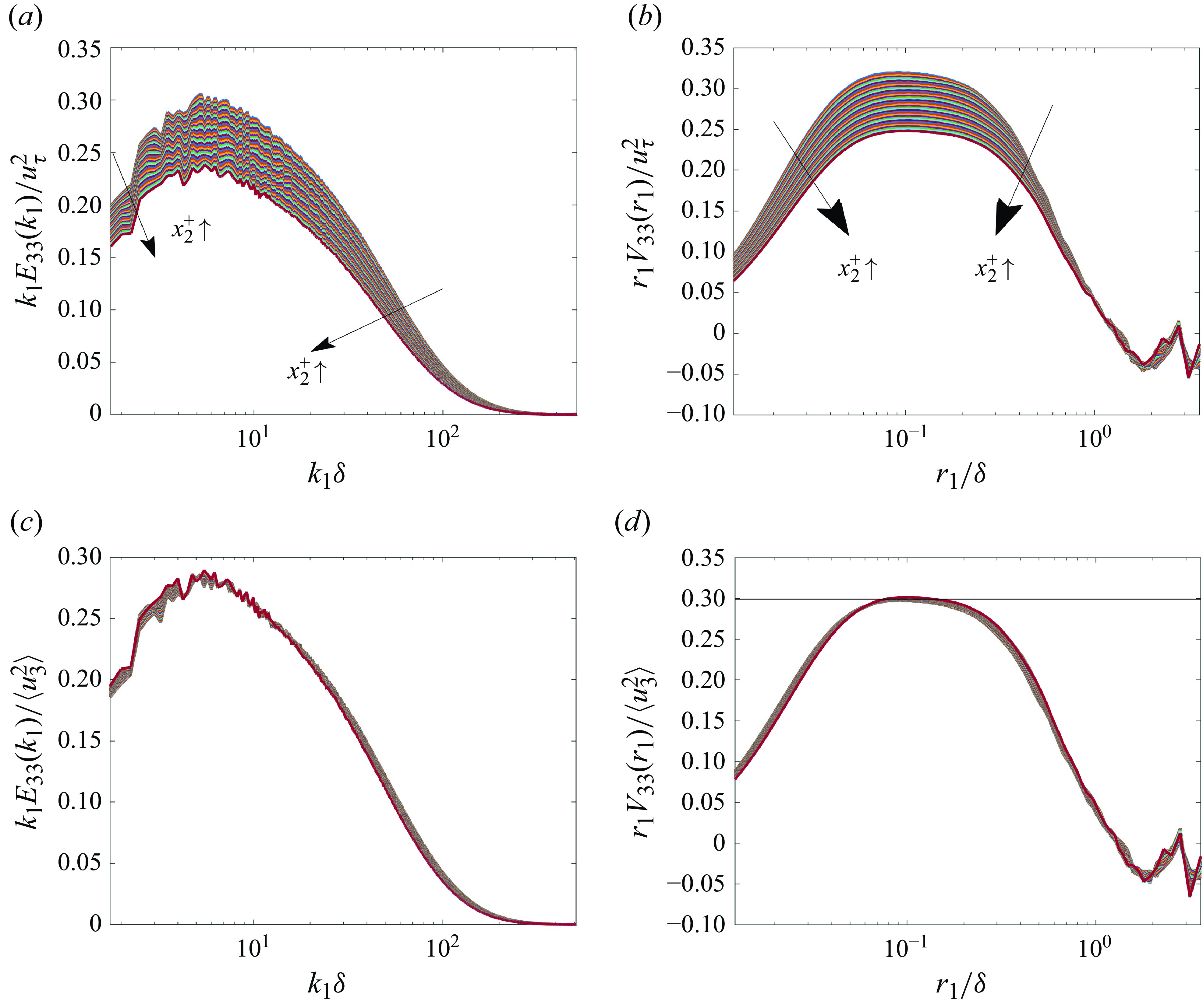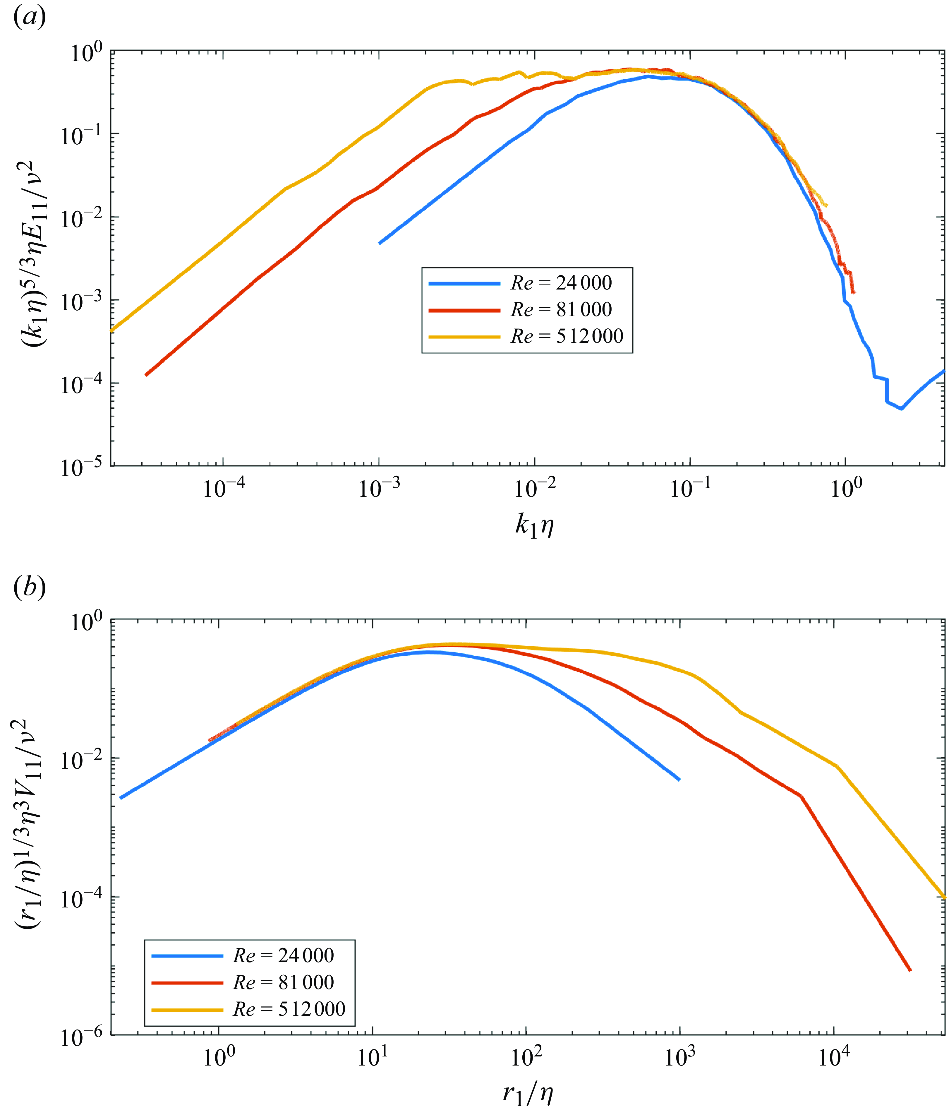 corresponding to the spectra of figure 6(a). Complementary to the spectral results, we note a plateau emerging and broadening with increase in Re. Similarly, we note a collapse onto a universal curve at small scales, with the collapsed region broadening with increase in Re.