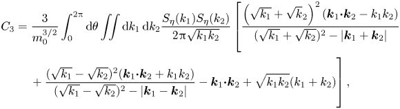 \begin{align} C_3 &= \frac{3}{m_0^{3/2}}\int_0^{2{\rm \pi}} \mathrm{d} \theta \iint \mathrm{d}k_1\,\mathrm{d}k_2 \frac{S_\eta(k_1) S_\eta(k_2)}{2 {\rm \pi}\sqrt{k_1k_2}}\left[ \frac{\left(\sqrt{k_1}+\sqrt{k}_2\right)^{2}(\boldsymbol{k}_{1} \boldsymbol{{\cdot}} \boldsymbol{k}_2 -k_1k_2)}{(\sqrt{k_1} +\sqrt{k_2})^{2}-\vert \boldsymbol{k}_1+ \boldsymbol{k}_2 \vert}\right.\nonumber\\ &\quad \left.\vphantom{\frac{\left(\sqrt{k_1}+\sqrt{k}_2\right)^{2}(\boldsymbol{k}_{1} \boldsymbol{{\cdot}} \boldsymbol{k}_2 -k_1k_2)}{(\sqrt{k_1} +\sqrt{k_2})^{2}-\vert \boldsymbol{k}_1+ \boldsymbol{k}_2 \vert}}+ \frac{(\sqrt{k_1}- \sqrt{k_2})^{2} (\boldsymbol{k}_1\boldsymbol{{\cdot}} \boldsymbol{k}_2 +k_1k_2)}{ (\sqrt{k_1}- \sqrt{k_2})^{2}- \vert \boldsymbol{k}_1 - \boldsymbol{k}_2 \vert} - \boldsymbol{k}_{1} \boldsymbol{{\cdot}} \boldsymbol{k}_2 + \sqrt{k_1k_2}(k_1+k_2) \right], \end{align}
