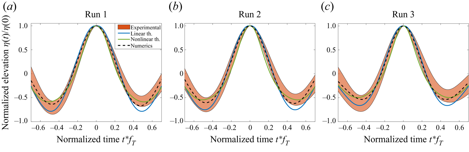$f_T$. Here, ‘exp’ denotes experimental measurements, ‘num’ numerical models and ‘th’ theoretical estimates given by (4.1) and (4.3) and computed based on the experimental PSD. The number of waves