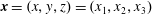 $\boldsymbol{x}=(x,y,z)=(x_{1},x_{2},x_{3})$