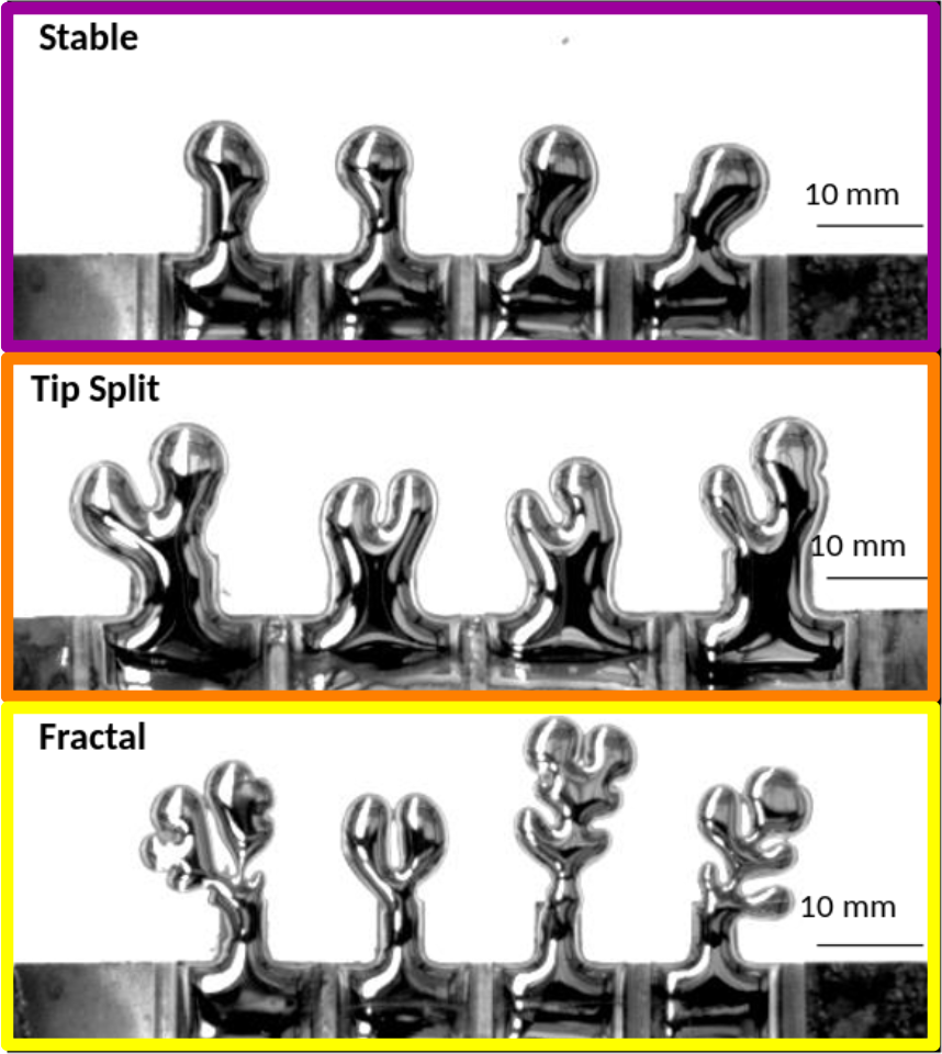 Abstract: A droplet of pure water placed on a clean glass surface will spread axisymmetrically, and a droplet of mercury will bead up into a spherical droplet. In both cases, the droplet is minimizing its surface energy -- creating an object with a minimized surface area -- and there is nothing to break the symmetry. Remarkably, droplets of the room-temperature liquid gallium-indium (EGaIn), which like all metals have an enormous surface tension, can nonetheless undergo fingering instabilities in the presence of an oxidizing voltage. I will describe how this oxide acts like a reversible surfactant, generating fingering instabilities, tip-splitting, and even fractals, through Marangoni instabilities. Remarkably, we find that EGaIn droplets placed in an electrolyte under an applied voltage can achieve near-zero surface tension. This effect can in turn be used to suppress the Rayleigh-Plateau instability in falling streams. Quantitative control of these effects provides a new route for the development of reconfigurable electronic, electromagnetic, and optical devices that take advantage of the metallic properties of liquid metals.