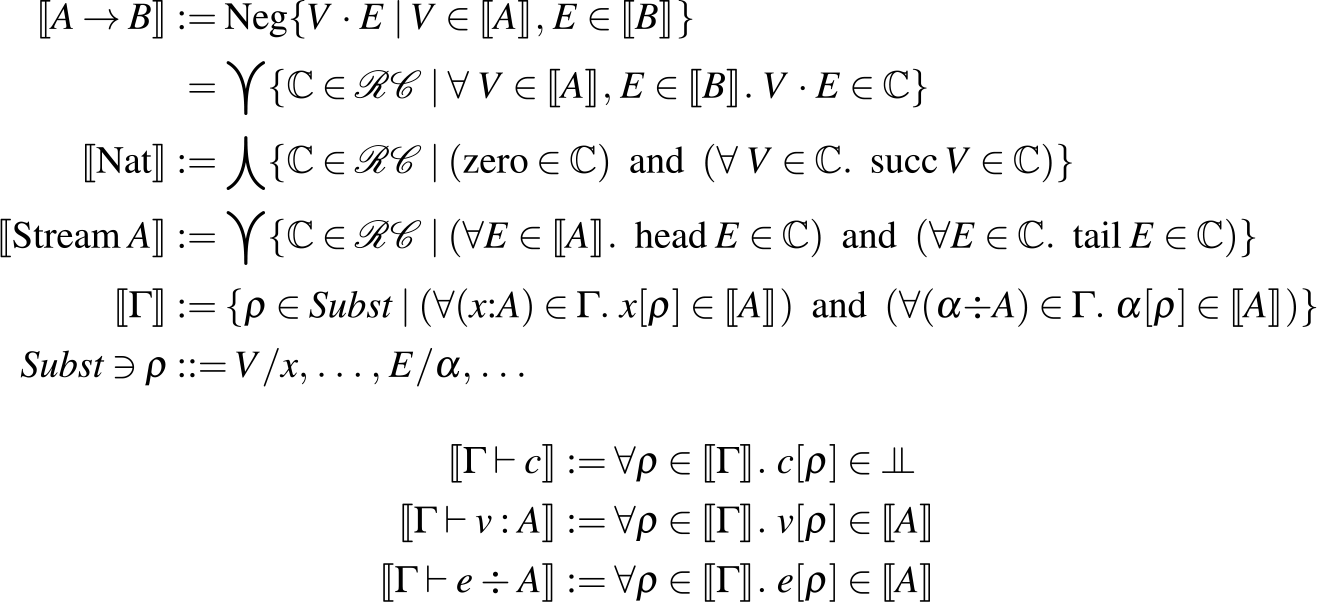 Yet, even though we have added infinite streams, we don’t want to ruin System T’s desirable properties. So in Section 6, we give an interpretation of the type system which extends previous models of finite types (Downen et al., Reference Downen, Johnson-Freyd and Ariola2020, Reference Downen, Ariola and Ghilezan2019) with the (co)recursive types of numbers and streams. The novel key step in reasoning about (co)recursive types is in reconciling two well-known fixed point constructions—Kleene’s and Knaster-Tarski’s—which is non-trivial for classical programs with control effects. This lets us show that, even with infinite streams, our abstract machine is terminating and type safe (Theorem 6.14).