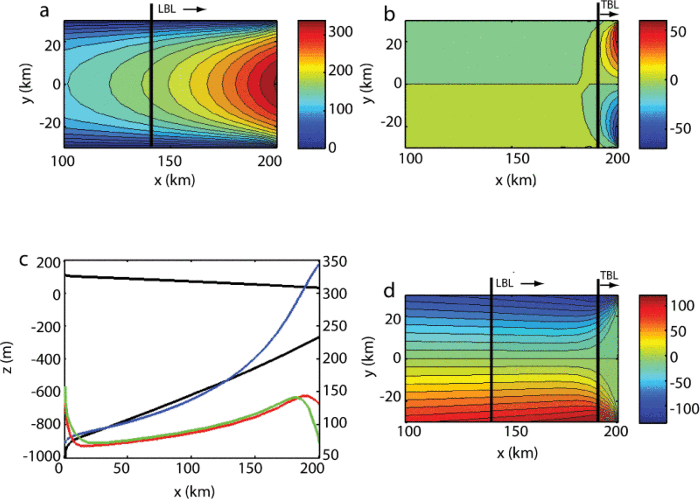 Fig. 1. Illustrations of boundary layers with numerical calculations. Flow is towards calving front on right; lateral margins have prescribed zero velocity, upstream end has prescribed longitudinal velocity and shear stress. Horizontal axes represent distance in kilometres along flow; in (a), (b) and (d) the vertical axis represents distance across the shelf. (a) Contours of longitudinal velocity fields (ma−1) showing acceleration over longitudinal boundary layer (LBL); (b) contours of transverse velocity fields (ma−1) showing acceleration over transverse boundary layer (TBL); (c) plots of ice geometry (m) (black; left axis) and velocity (ma−1) (blue), normal traction, S xx (kPa) (red), and twice longitudinal stress τ xx (kPa) (green) (right axis) (d) Contours of shear stress (kPa) showing decrease across transverse boundary layer. See Appendix D for details of prediction of boundary layer extent.