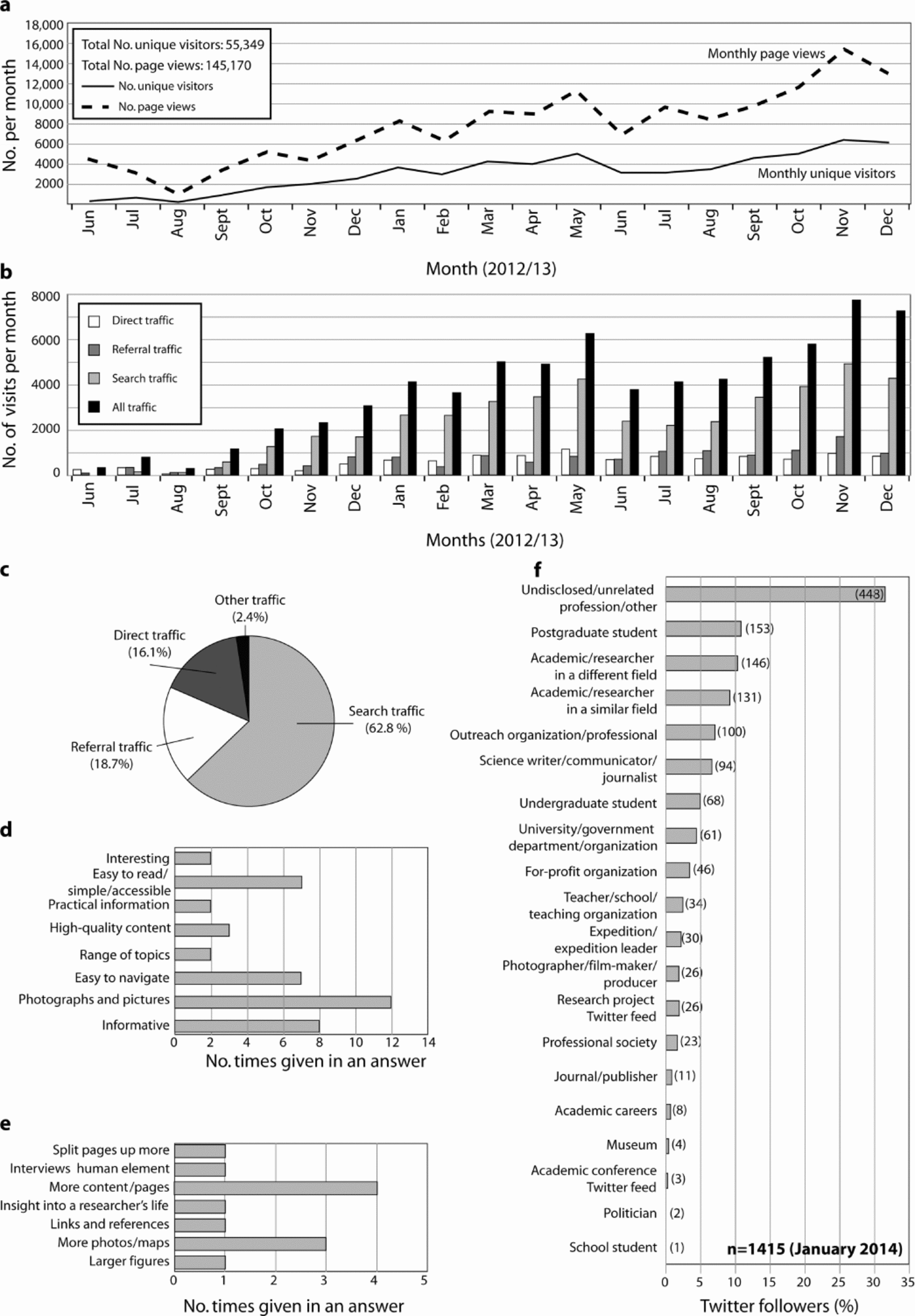 Suggestions for improvements received in the survey included more, and larger, photographs, especially in the glossary, more maps and diagrams, increasing links both within-site and to external sites, more content and science pages, and more ‘human interest’, such as the day-to-day life of a researcher, fieldwork diaries and interviews (Fig. 2d).