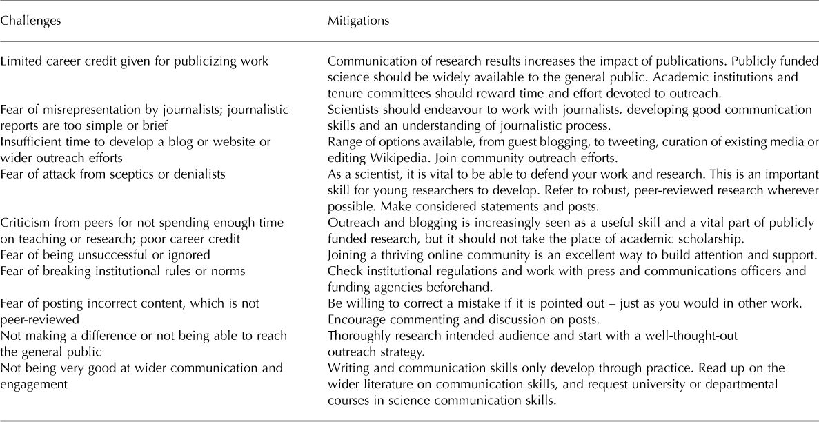 Table 1. Common challenges and mitigations for scientists engaging in online science communication (Reference PetersPeters and others, 2008a; Reference Besley and TannerBesley and Tanner, 2011; Reference HarrisHarris, 2011; Reference Somerville and HassolSomerville and Hassol, 2011; Reference Bik and GoldsteinBik and Goldstein, 2013; Reference Darling, Shiffman, Côté and DrewDarling and others, 2013; Reference SmithSmith and others, 2013; Reference Stewart and NieldStewart and Nield, 2013)