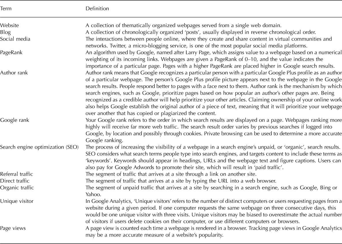 Online science communication has numerous benefits for the researcher. For example, writing about new articles or topics requires a deeper understanding of the literature, which may often be outside the researcher’s normal realm (Reference BonettaBonetta, 2007). Literature must also be read while it is fresh and new; the article needs to be written in a timely manner to be relevant. Writing articles in an easy-to-read, accessible format will help develop writing skills. Website authors and bloggers will gain a deeper understanding of the internet, programming and search engine optimization, all of which have practical uses in an academic career, and may even open up different career options. Bloggers are more aware of online resources, which may help develop innovative teaching resources. Figures, maps and conceptual diagrams are easily translated into lecture slides, and vice versa; indeed, blogging and teaching are mutually beneficial since science communication and pedagogy share many of the same skills, both being based in effective communication.