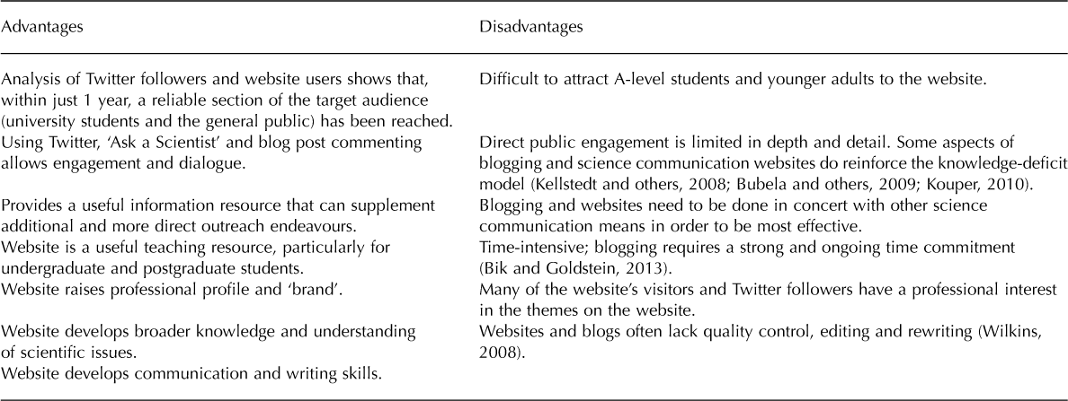 There are a number of criticisms of the use of digital media as a tool for science communication, including that it generally only reaches a few already knowledgeable science enthusiasts and professionals (Reference BubelaBubela and others, 2009; Reference KouperKouper, 2010). Indeed, internet use correlates with income, gender, education and location: people using the internet for research are likely to be affluent and relatively well educated (e.g. Reference FloresFlores, 2003, from research in Chile). Critical evaluation of the effectiveness of digital media in science communication is rare (Reference Shema, Bar-llan and ThelwallShema and others, 2012). Blogs and websites may also reinforce the knowledge-deficit model of science communication (Reference BubelaBubela and others, 2009). Reference KouperKouper, (2010) found that blogs and websites rarely provide the extensive critique or articulation on controversial issues that they may claim. Finally, websites and blogs are time-expensive, require skill and research and may provide academics with limited career credit (Table 1).