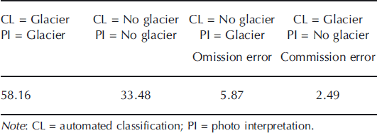 Table 7. Producer’s, user’s and overall accuracy for the two classes (glacier and non-glacier areas) derived from supervised classification using the maximum likelihood algorithm