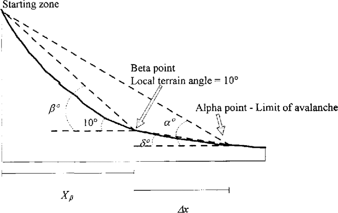 where Δx is the horizontal distance from the β point to the maximum reach of the avalanche, X β is the horizontal distance from the starting zone to the β point, α and β are the angles to the starting zone from the maximum reach of the avalanche and the β point, respectively, and δ is the angle from the maximum reach of the avalanche to the β point (Fig. 5).