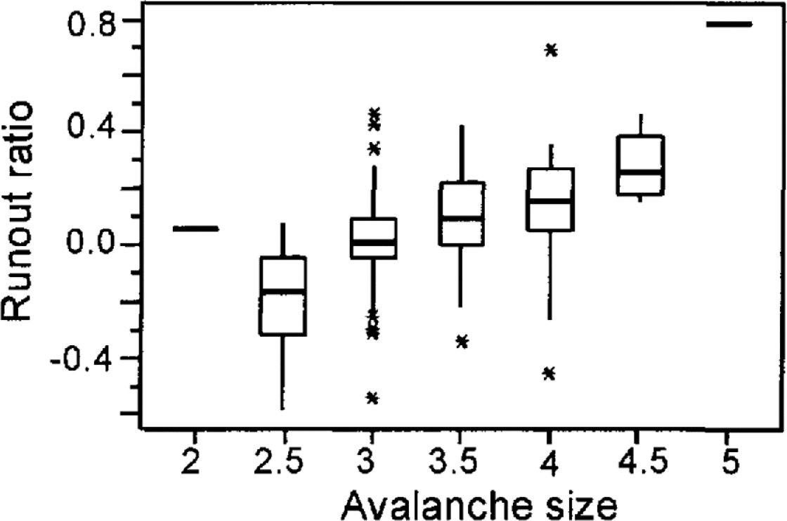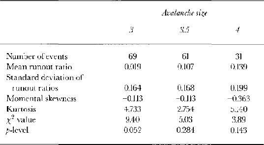 Table 3. Runout ratio statistics for avalanche sizes 3–4, with an assessment of fit to the normal distribution