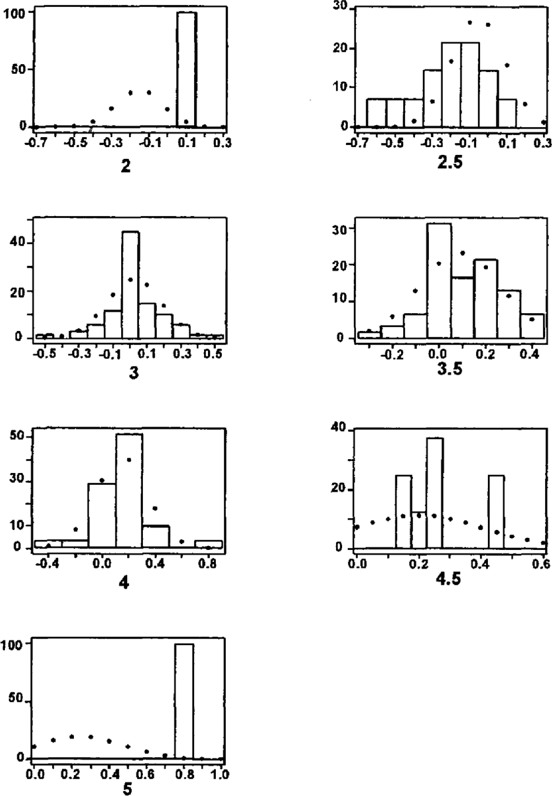 The above strategy was not valid for the distribution of the relative frequency of different sizes since it is cumulative. Therefore, as an alternative perturbation, the values for the larger sizes (>2.5) were increased by 10%, while the proportions for the smaller sizes were reduced by the same degree. The distribution was then renormalized to sum to unity. Because there is a fair degree of uncertainty in this distribution through the use of the Canadian data, a second, larger perturbation was introduced. The proportions for the larger sizes were increased by 30%, and those for the smaller sizes reduced by 10%.