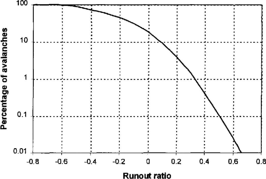 Figure 8 shows how the percentage of avalanches reaching or exceeding a specific runout ratio varies according to model simulation. This plot combines the relative size-frequency distribution listed in Table 2 with the runout distributions derived above. At this stage, width and direction effects are not included. The plot was constructed by determining the probability of exceeding a runout ratio value for each size–runout distribution and weighting this probability by the relative frequency of the given size. This calculation was performed for 100 different runout ratios between –0.8 and 0.8, sufficient to permit the points to be connected. There is no variability about the line, because the model was solved exactly for each point. It is evident that a runout ratio of 0.33 is exceeded by 1% of events according to the model.