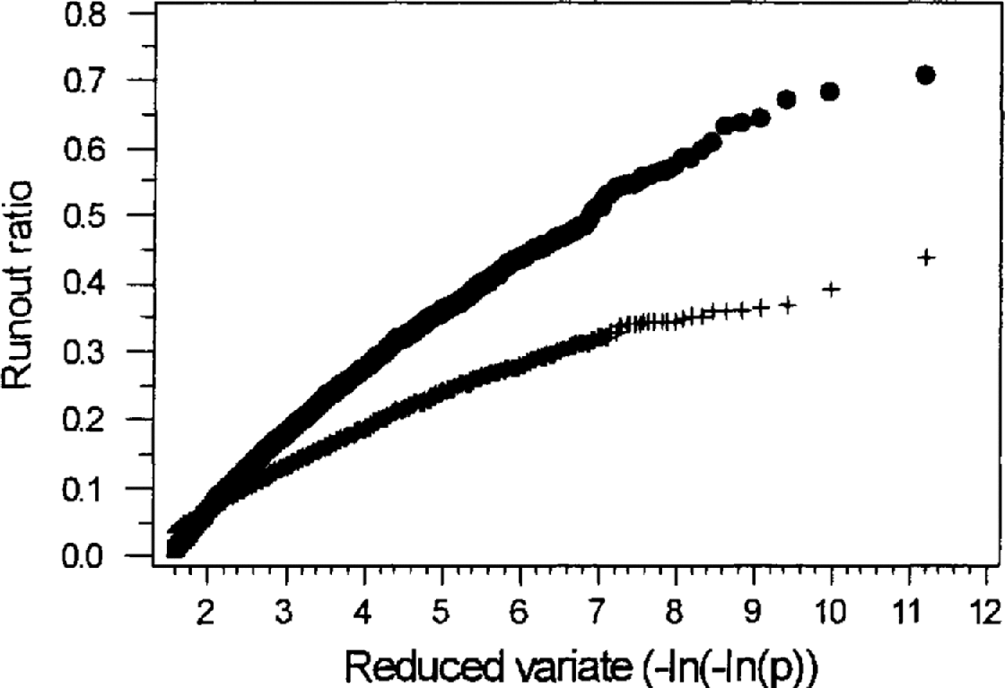 Fig. 9. Results for a model simulation (solid circles) compared to a Gaussian distribution (crosses) with the same mean and variance. The plot is scaled such that a Gumbel distribution will plot as a straight line. The data are censored at an arbitrary runout ratio (zero) in accordance with Reference Föhn and Meister.Föhn and Meister (1981).