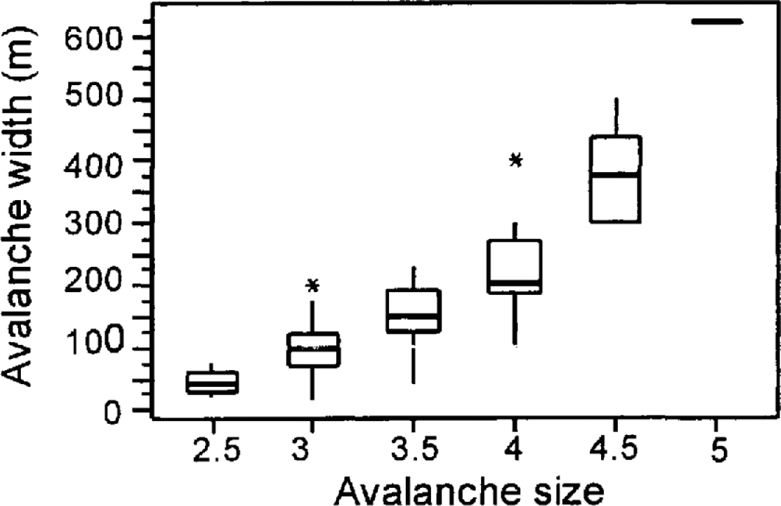 Instead of a normal distribution, the gamma distribution yielded the highest degree-of-fit to the data for sizes 3, 3.5 and 4 (the three sizes with enough data to permit an attempt at distribution fitting). Intuitively, this distribution is appealing, because avalanches cannot have zero or negative widths, values that are unacceptable for this distribution. Box plots of the available data are provided in Figure 10.