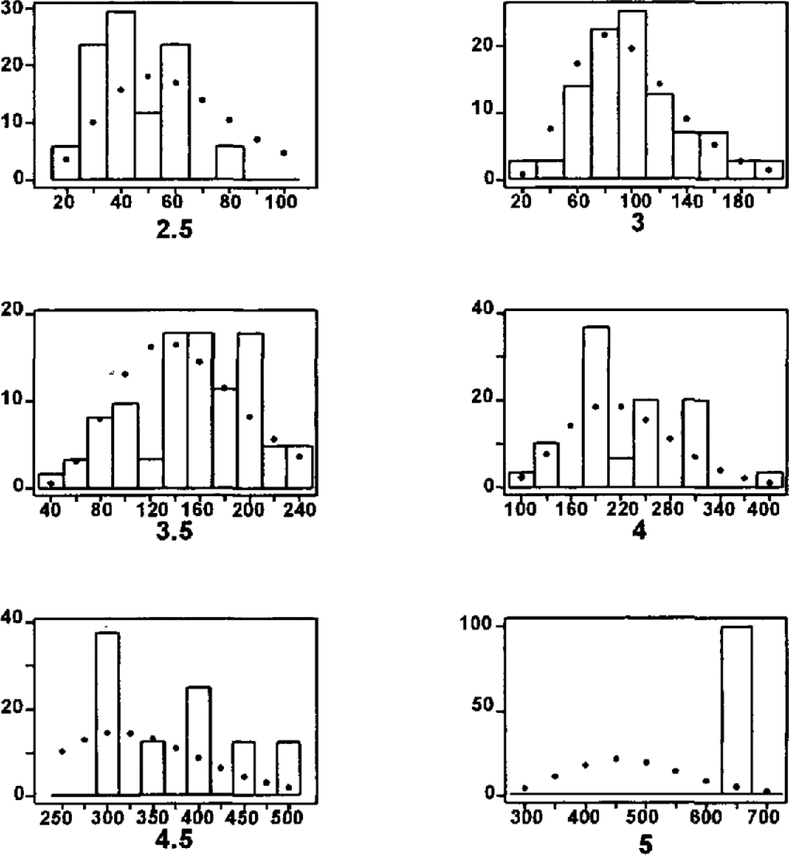 The degree-of-fit of the gamma distribution to the width data is given in Table 5, along with the distribution parameters. The goodness-of-fit is heavily influenced by the fact that many widths can only be estimated to one or two significant digits. This effect is particularly noticeable for the size 4 data where the mode incorporates the 200 m wide events and secondary peaks exist for the 300 and 250 m data classes. This lack of precision in the data results in a distortion that is reflected in the relatively poor fits to the larger sizes where width measurements are less accurately recorded.