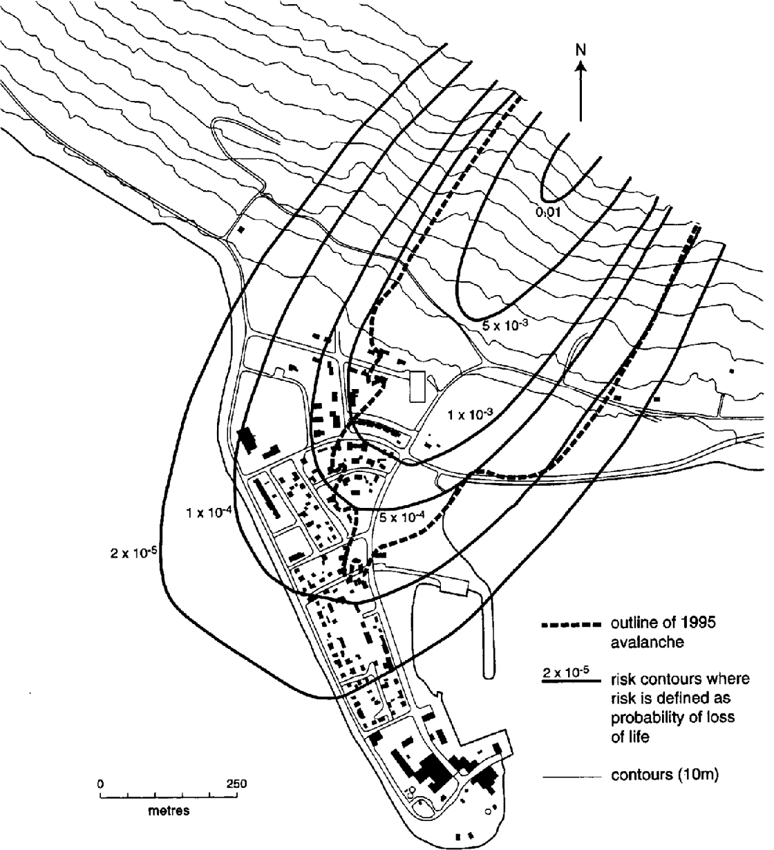 The catastrophic Flateyri avalanche of October 1995 was released from the Skollahvilft bowl at 650 m altitude. It proceeded to run down to the town along the Eyrarhryggur path and damaged or destroyed 29 houses. Figure 12 shows the town, together with various risk contours for this one particular path produced using the model outlined in this paper. It must be noted that another path also runs into the town, and thus the combined risk at any point is the sum of the two values.