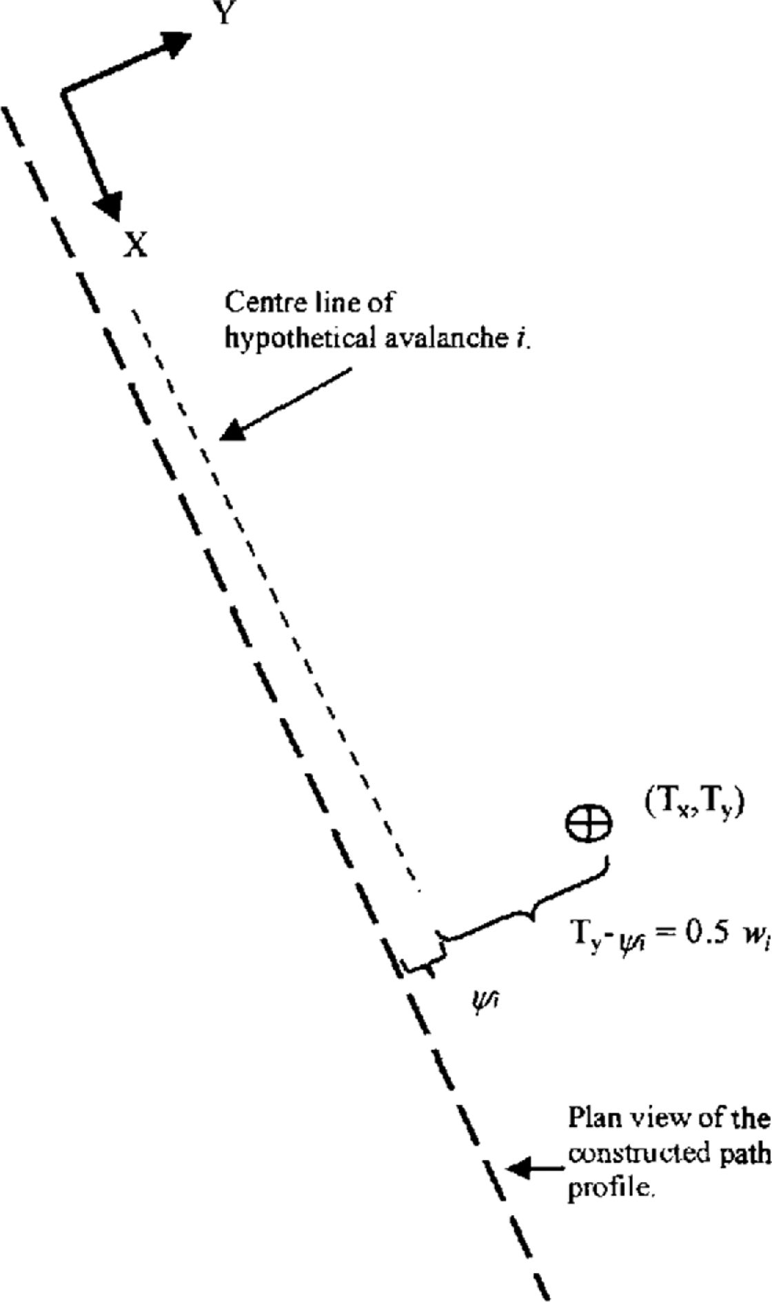 where f is the average avalanche frequency (events per year) on the path, r n is the relative frequency of the given size and P(T) is the probability of an event reaching a target point T, with coordinates (T x, T y), where x is distance along the profile and y is distance perpendicular to the profile (Fig. 3). In our approach, f is typically determined by avalanche observation on the selected path, r is determined directly from the distribution for the relative frequency of different avalanche sizes and P(T x)n is found from the runout PDF for the given size. The evaluation of P(T y)n is more complex because this term reflects the interaction of variable avalanche width and differences in avalanche trajectory, both of which contribute to lateral variation in avalanche extent: