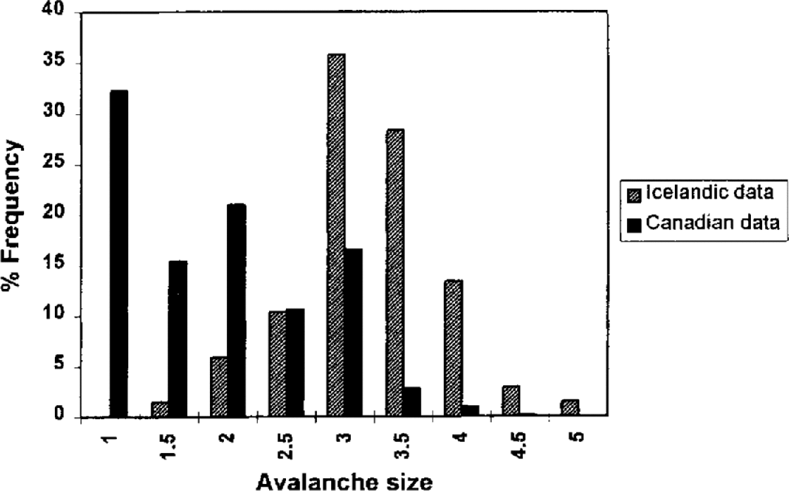To combine the Canadian and Icelandic data, the size of the avalanches in Iceland had to be estimated. Where the deposit volume had been estimated, a “typical“ density value of 350 kg m−3 was used to calculate avalanche mass, with sizes allocated based on the mass values given in Table 1. Because the Canadian size classification is based on a logarithmic or power-law relationship, any error introduced by using a single density value should not be significant.