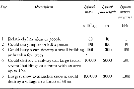 Unfortunately, detailed information on how avalanches of particular sizes affect structures is very limited. This is partly because size classifications (such as the Canadian scheme) are not widely adopted, and also because little applied research has been performed in relation to this problem.