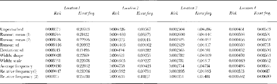 The sensitivity analysis was performed at four loca1ions in the region of concern for risk studies in Iceland (runout ratios of 0.0 0.4 and deviations from the center line of 0.0 100 m). It is evident that different distributions behave in different ways. In general, the model appears to be fairly robust. Even the quite drastic change to the form of the relative frequency distribution appears to perturb the risk values by only 30%. As risk values are order-of-magnitude assessments, this appears quite reasonable. The changes to risk values and event frequencies caused by a +10% perturbation are less for most distributions than a 10% increase in the average avalanche frequency. Thus, one of the important limits on this model is the knowledge of the average avalanche frequency. The accuracy of our knowledge of this factor is likely to improve dramatically as a result of the recently improved avalanche observation in Iceland.
