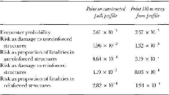 The maximum extent of the avalanche deposit for the 1995 event was approximately 110 m to the side of the constructed path profile. Using the full model including width and deviation effects, the estimated exceedance probability at this point is 0.0036 (278 year return period). The corresponding exceedance probability for a location a similar distance downslope but lying upon the constructed path profile was 0.0056 (178 year return period). Table 11 gives risk and encounter probability estimates at these two locations.