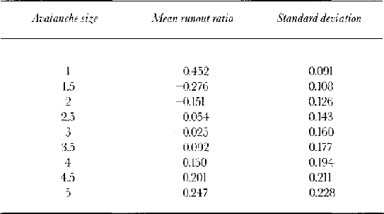 Table 4. Derived parameters for normal distributions of the runout ratio for individual avalanche sizes
