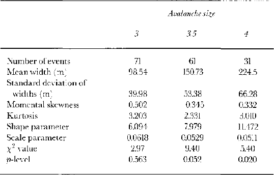 Table 5. Deposit width statistics for avalanche sizes 3–4, with an assessment of fit to the gamma distribution