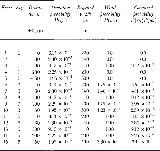 Table 7 provides an example of 15 hypothetical avalanche events of varying widths and deviations, for which the probabilities of hitting a hypothetical target point with coordinates (T x, T y) of (1200 m, 100 m) are evaluated. For the purposes of demonstration the evaluation of P(T x) is not mentioned here (this has already been discussed with reference to Figure 8). As Equation (13) shows, given that we are solving in 1 m increments, to evaluate P (T y) requires 1100 solutions to the product of the two distributions P(ψ i) and P(w i) for each of the nine avalanche sizes. The 15 events shown represent five of the 1100 calculations needed for three different size classes.