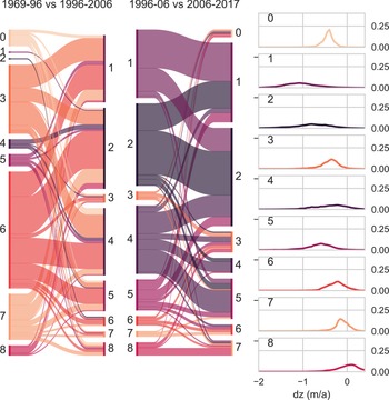 By tracing which node individual glaciers are mapped to in each of the three time periods, shifting melt patterns can be visualized on a regional scale (Figs 8, 9). As mentioned above, in period 1 most glaciers are mapped to nodes 3, 6 and 7 – patterns with a similar, moderate spread of dz values. Node 3 has a more negative frequency maximum than nodes 6 and 7, which exhibit noticeable positive surface elevation change on the right tail of the distribution. The majority of glaciers mapped to nodes 3 and 6 in period 1 shift to very broad nodes (1, 2 and 4) in period 2 (Fig. 9). In general, few glaciers remain in the same node between period 1 and 2. There is a clear tendency for glaciers to shift from narrow distributions to broader ones within the observed periods, besides the expected shift to increasingly negative frequency maxima. Most glaciers mapped to nodes 1 and 2 in period 2 remain there until period 3, or move from 1 to 2 or vice versa. Transitions from these very broad distributions back into narrower types are comparatively rare, although some shifts from broad distributions into very narrow ones do occur, as discussed previously. Some of the glaciers mapped to the least negative of the broad distributions (node 4) in period 2 shift to the less flat and more negative node 5 in period 3. In Figure 8, it is evident that a large majority of glaciers and particularly the larger glaciers in all regions have shifted to ‘flat’, strongly negative dz distribution patterns.