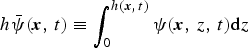 $h \bar {\psi }({\bi x},\,t) \equiv \int _0^{h({\bi x},\,t)} \psi ({\bi x},\,z,\,t) {\rm d} z$